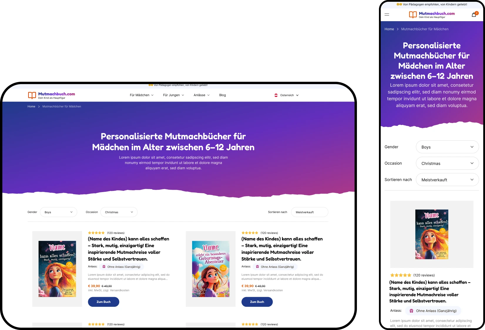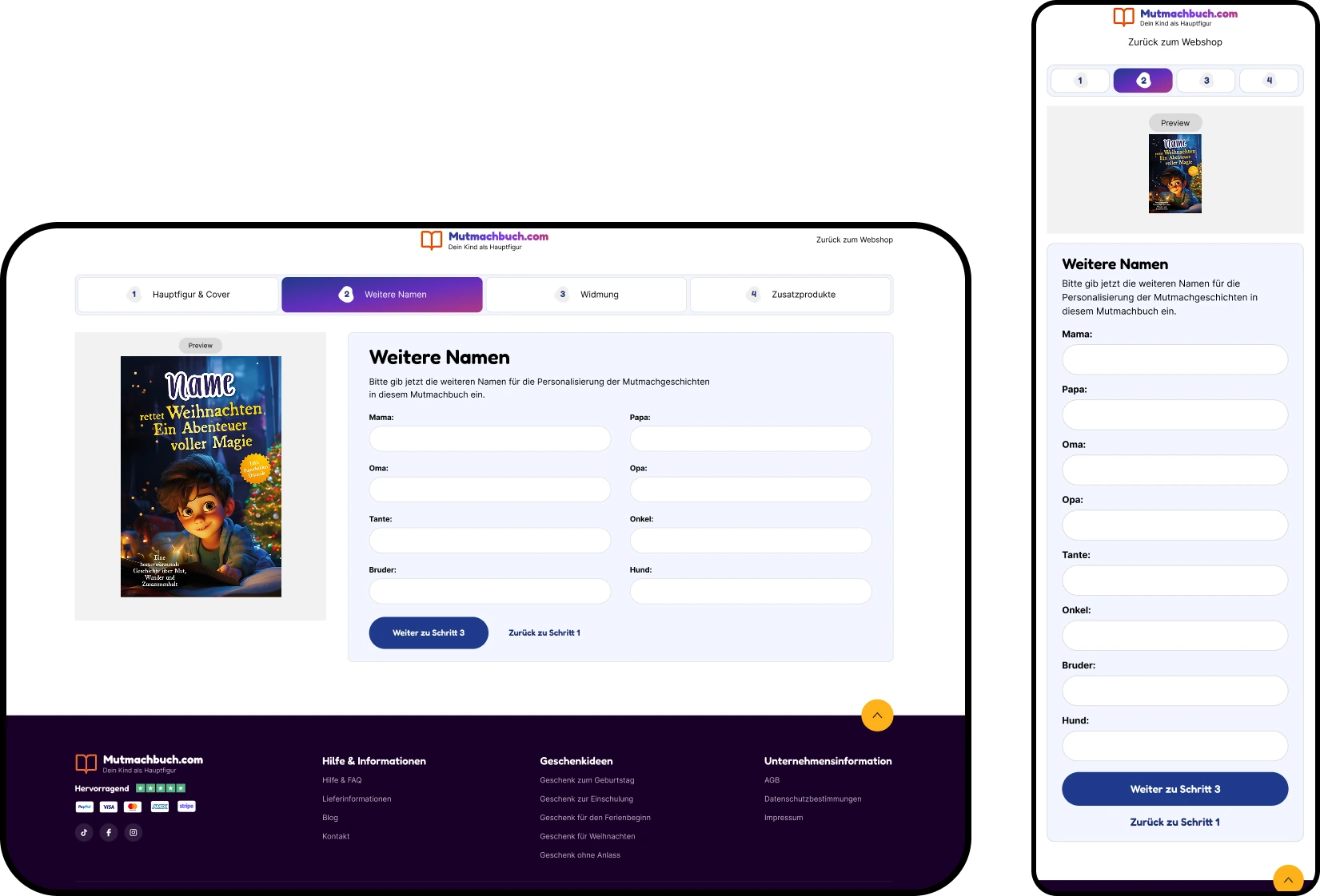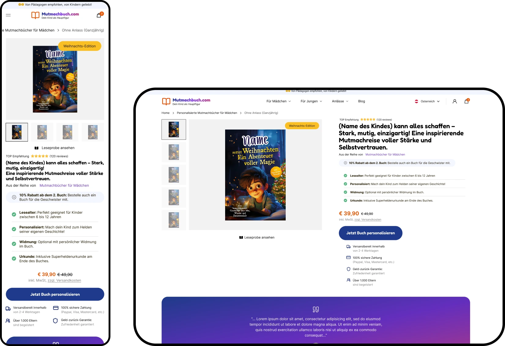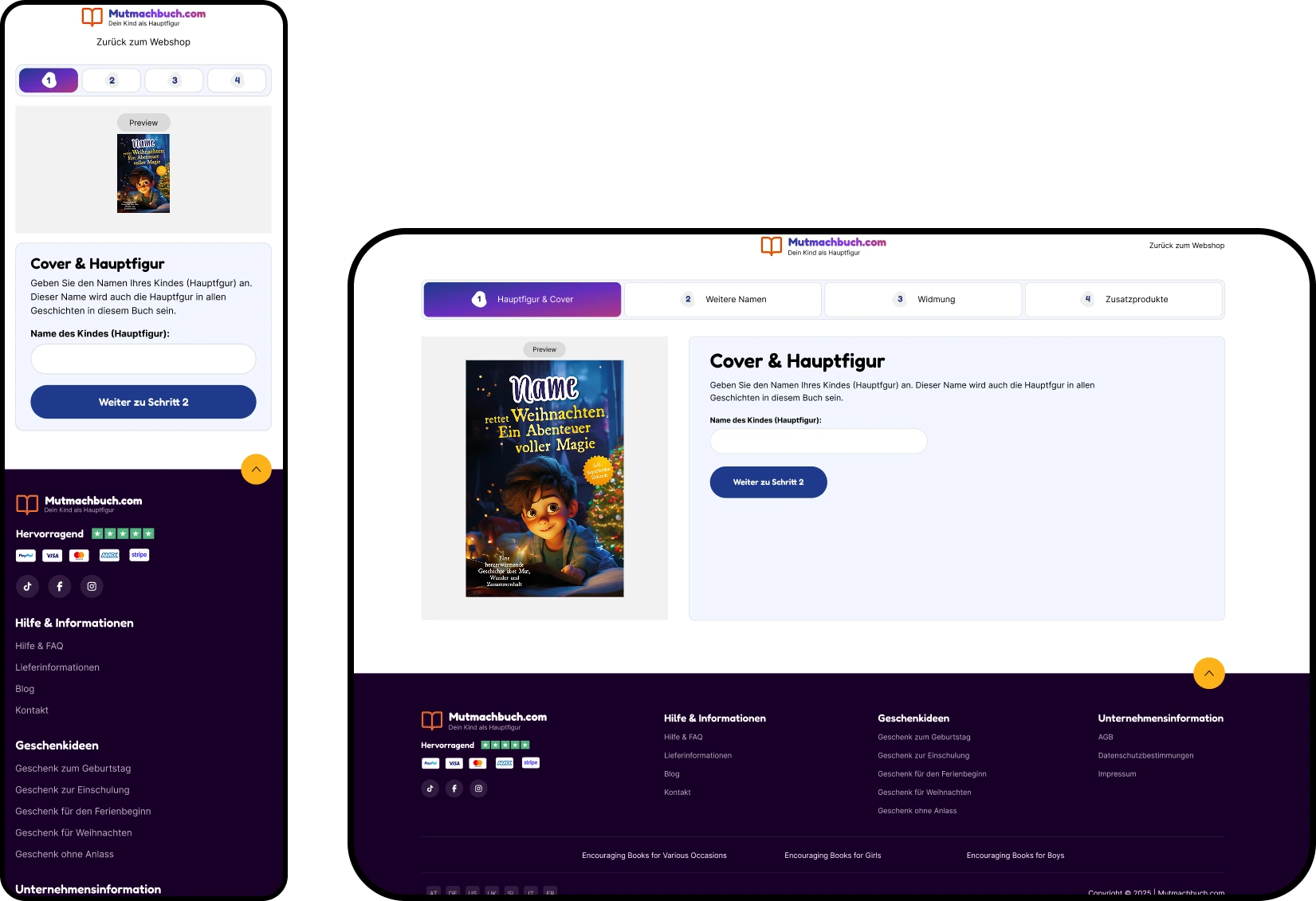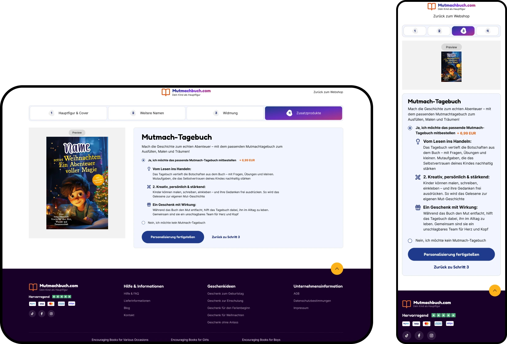 Mutmachbuch’s Shopify storefront enables fully personalized children’s empowerment books through a guided, multi-step personalization modal built with modern Web Components. Implemented on the Essence theme, the flow persists inputs, validates each step, and adds the main book plus optional dedication and diary as linked line items in a single cart request, with real-time cart bubble updates and an upsell prompt. The product experience includes sticky add to cart, product highlights, complementary products, pickup availability, and structured data.