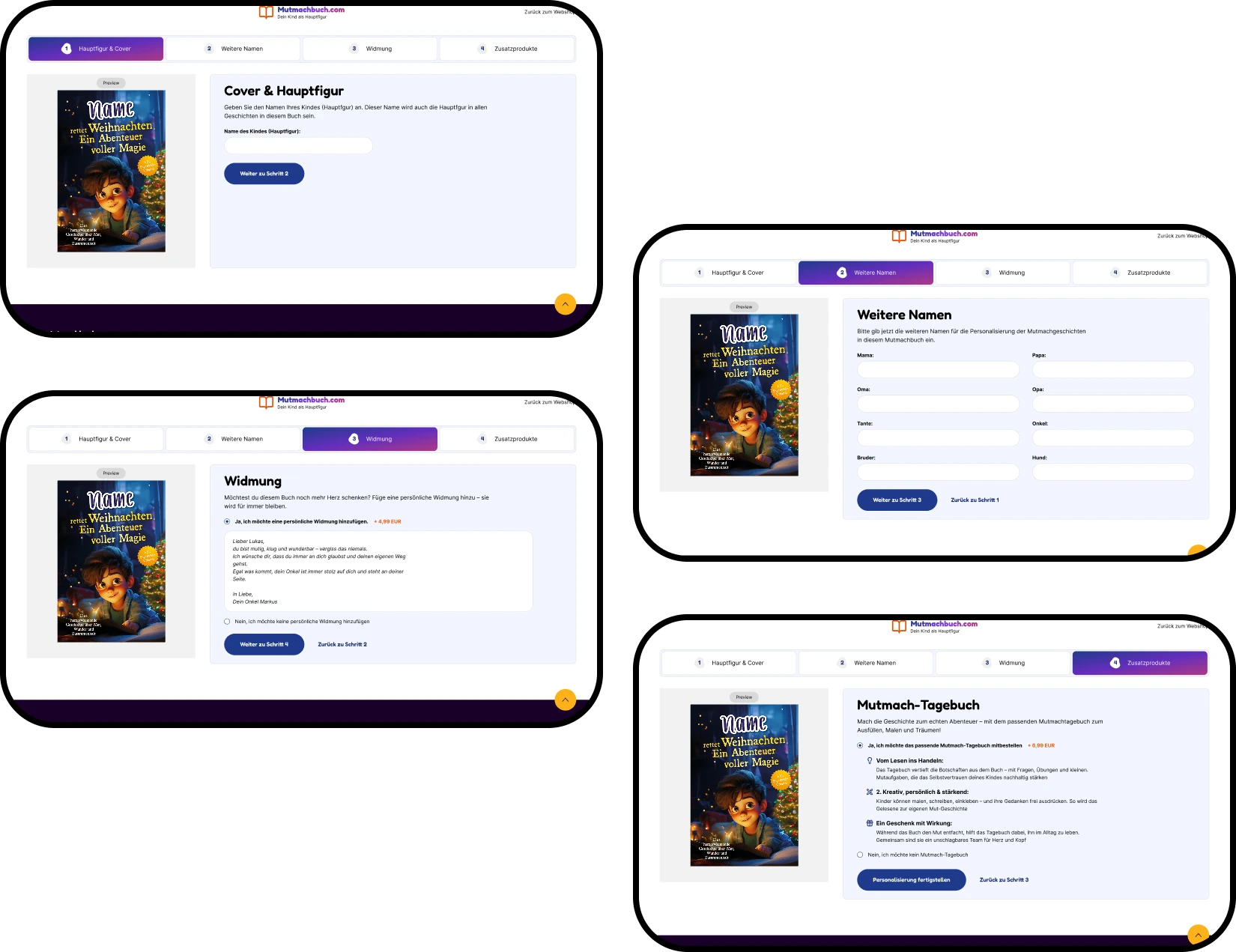 Book personalization is a wizard that overlays the whole screen and configures the entire book during purchase. The user gets a unique copy of their book that is printed on demand since all character names are decided in the wizard.