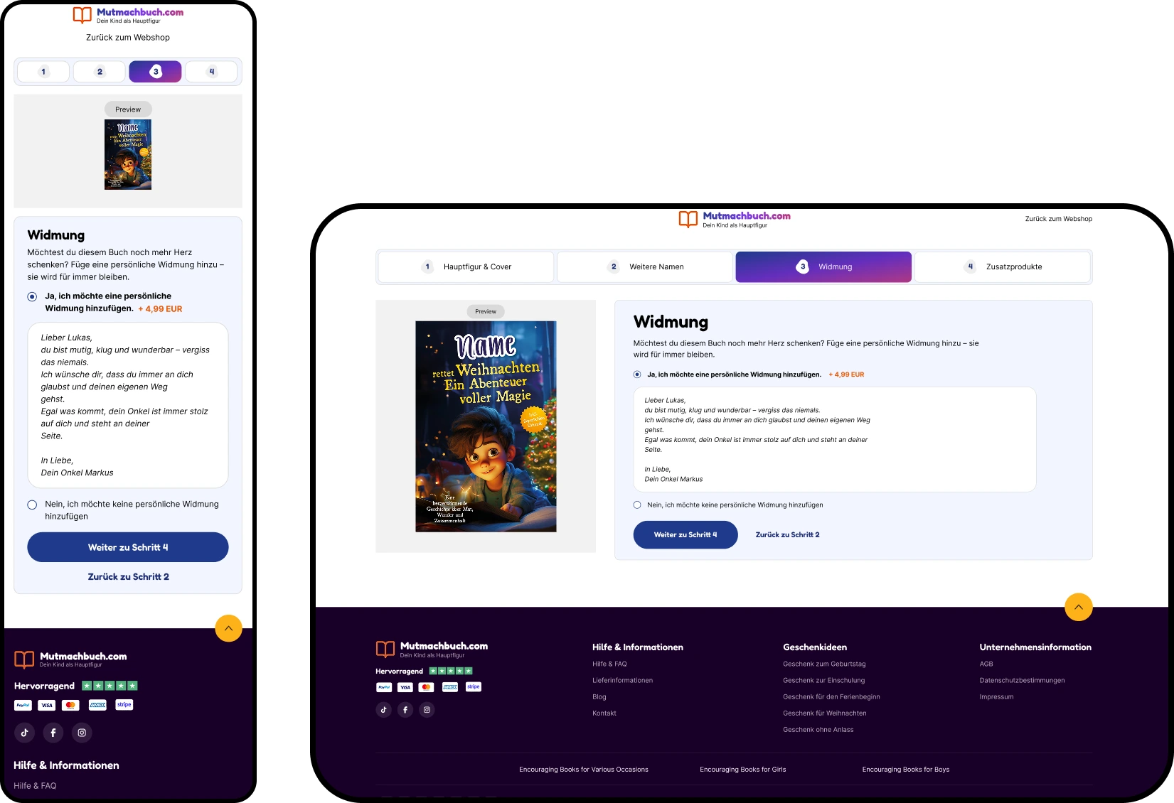 The last step features a special offer from the Mutmachbuch team and can be selected or declined. After this step, all items are added to the cart, and the user can choose to continue shopping or go to their cart.